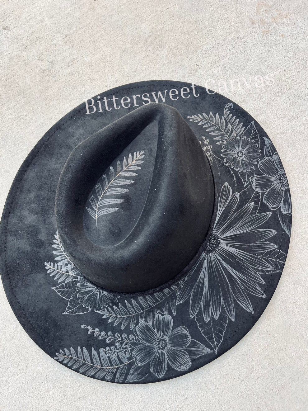 Black floral burned suede wide brim rancher hat