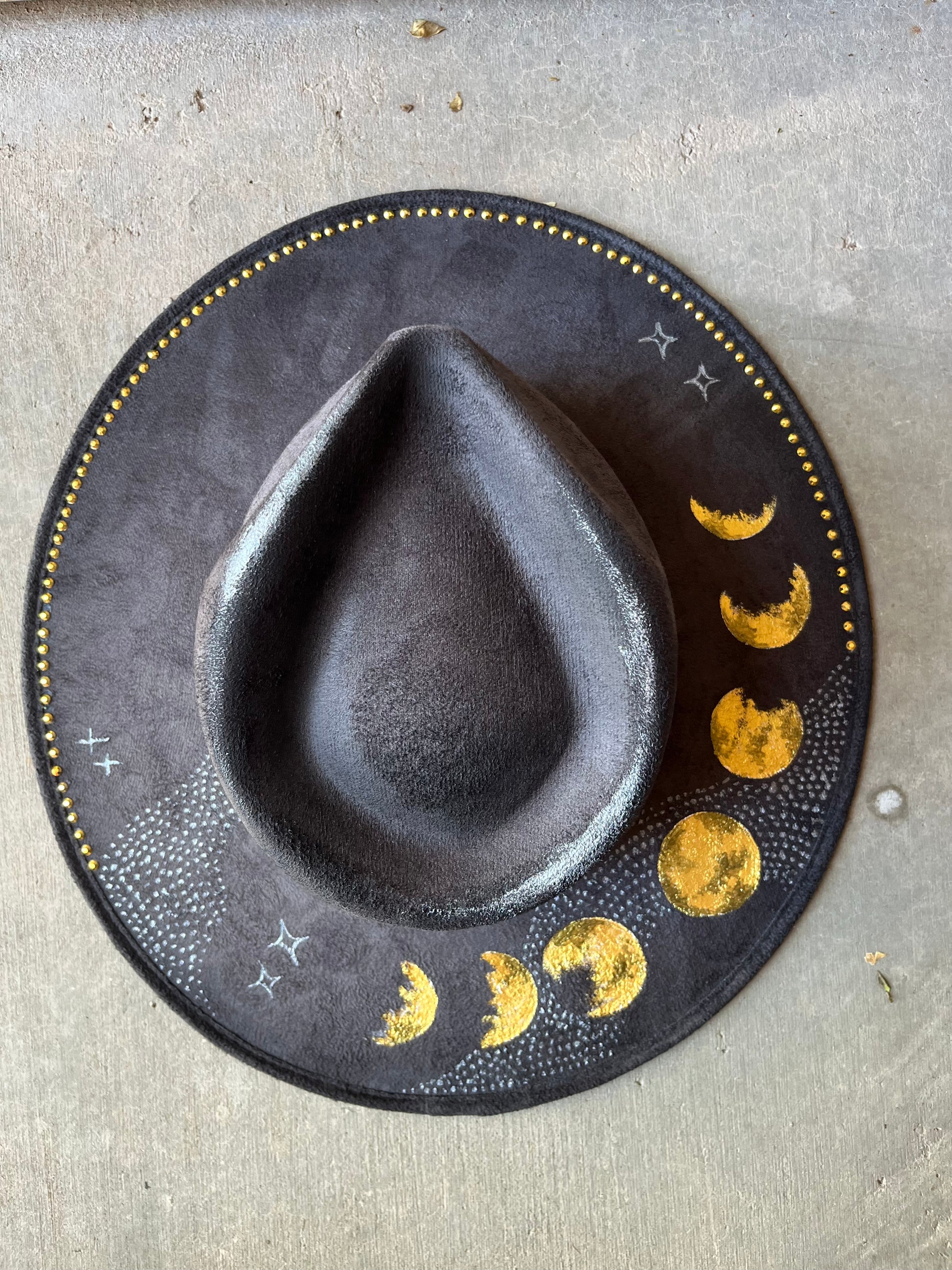 Dark grey moon phases gold burned suede wide brim rancher hat