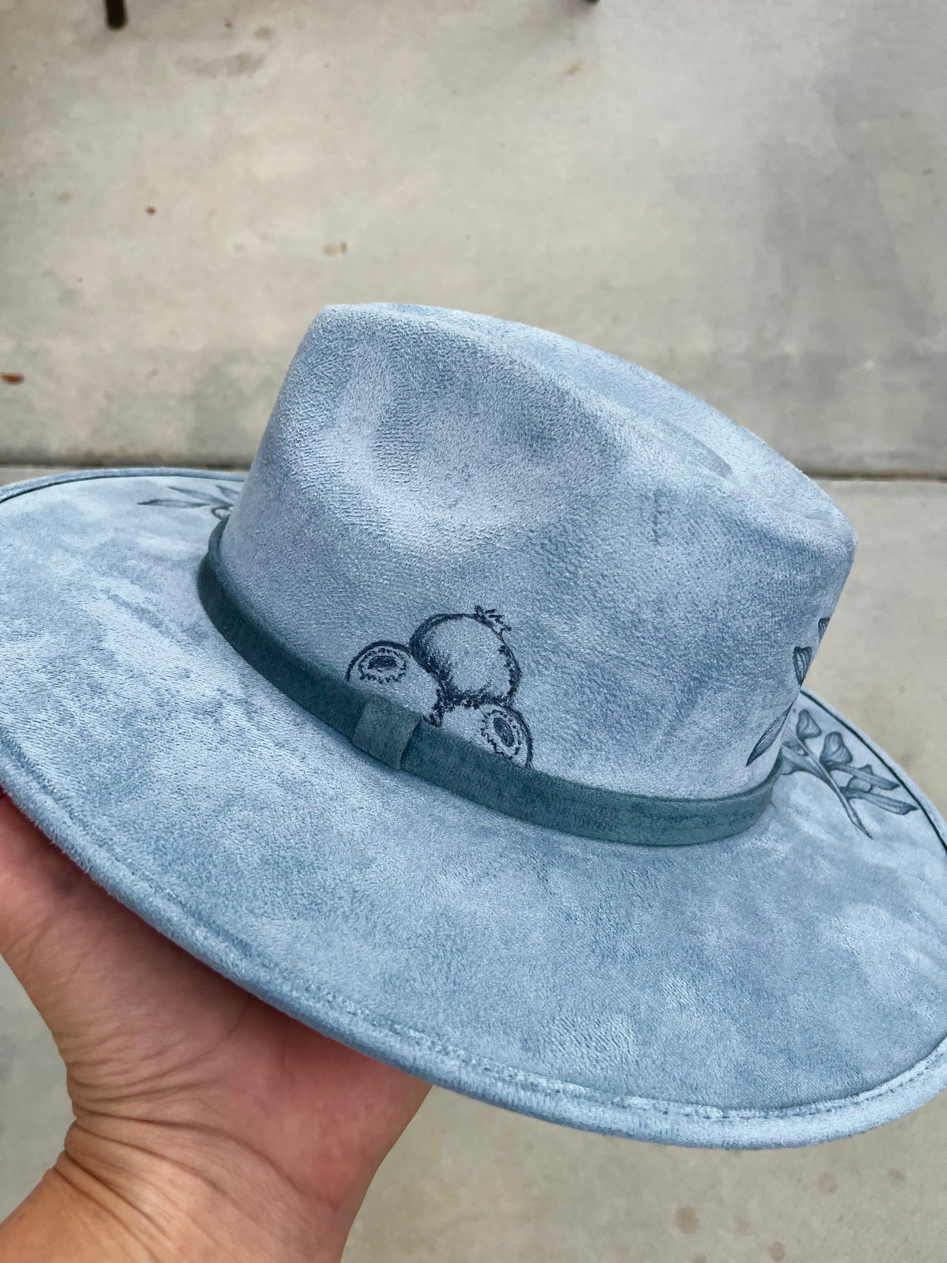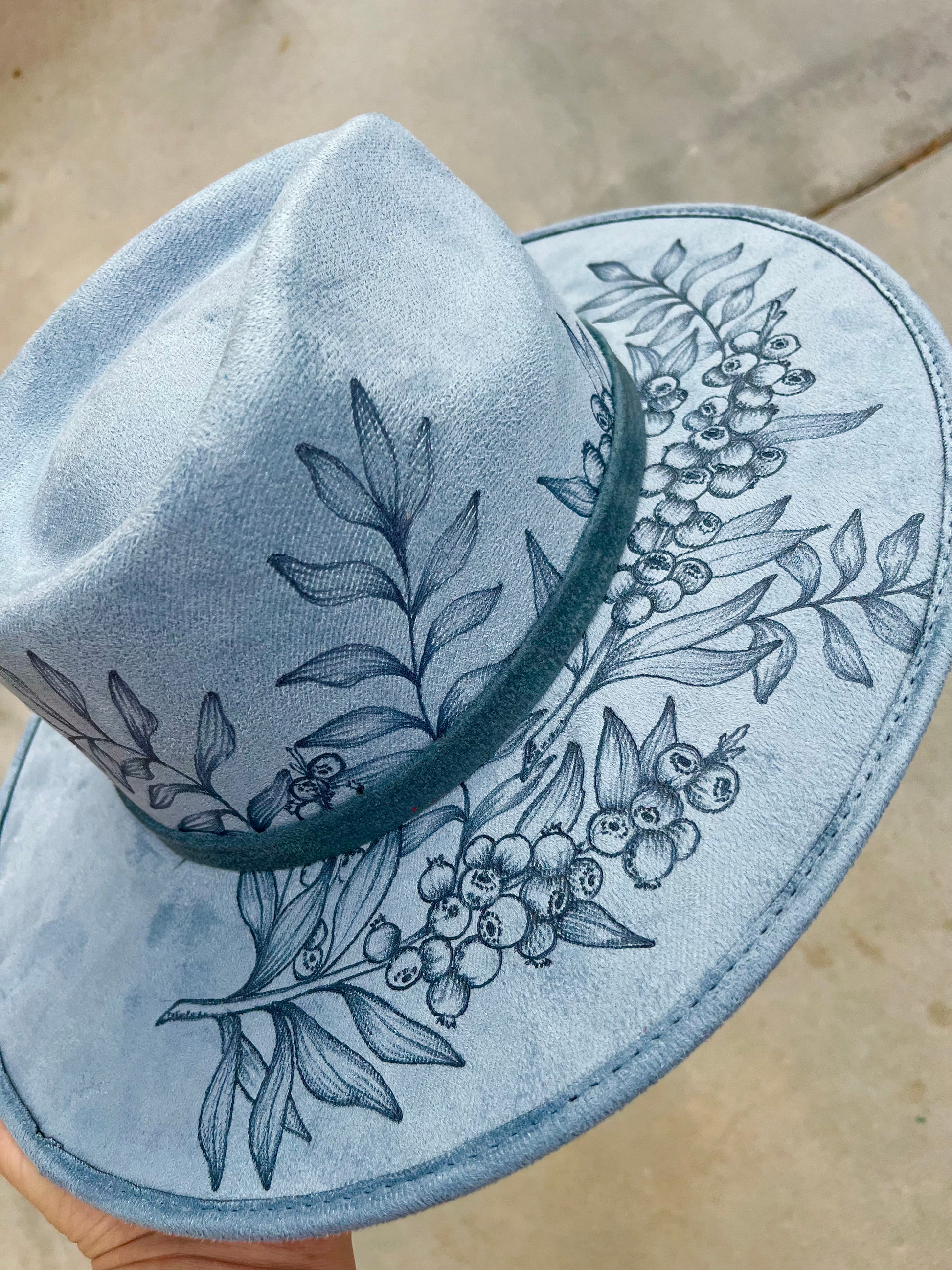 This handmade painted hat would make the perfect addition to any wardrobe. It is a wide brim hat. Vegan suede.