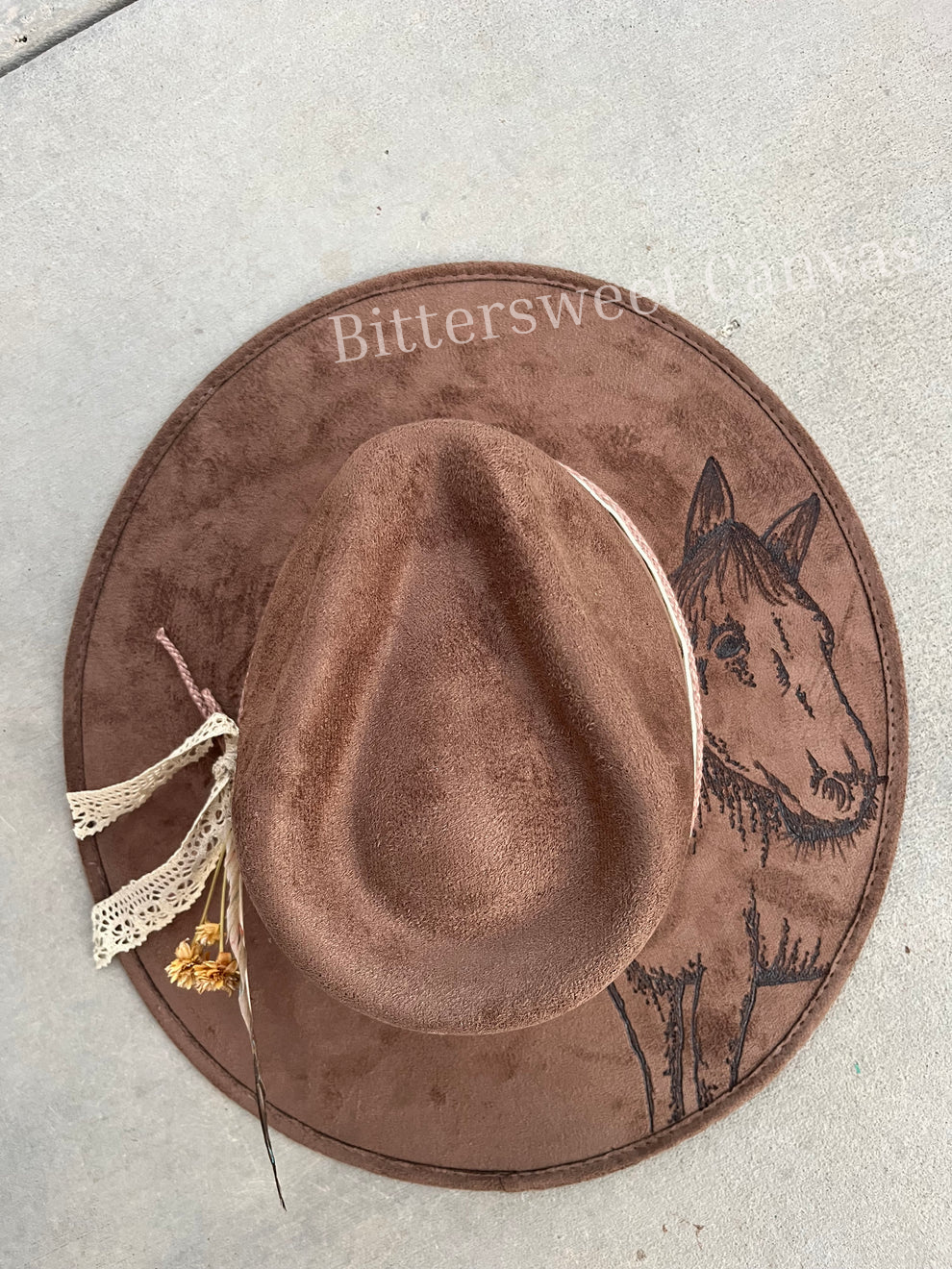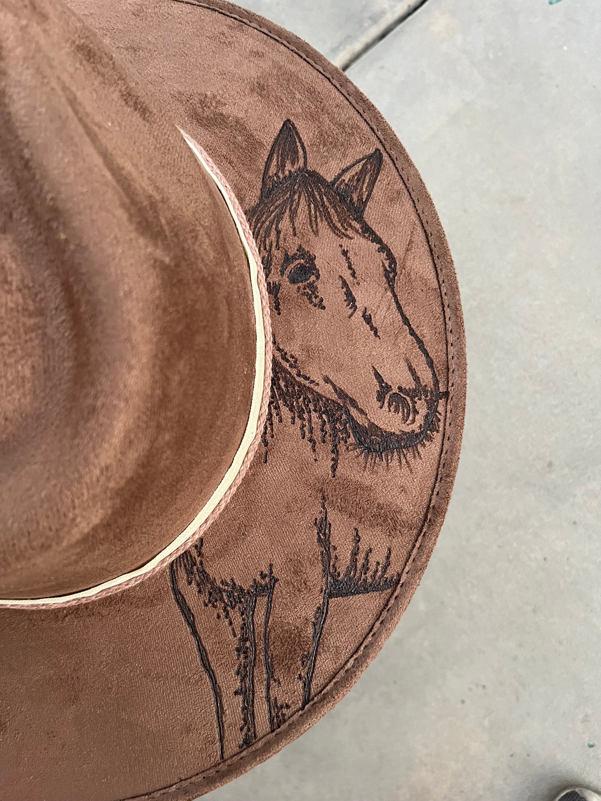Brown distressed horses burned accessorized fabric lined suede wide brim rancher hat