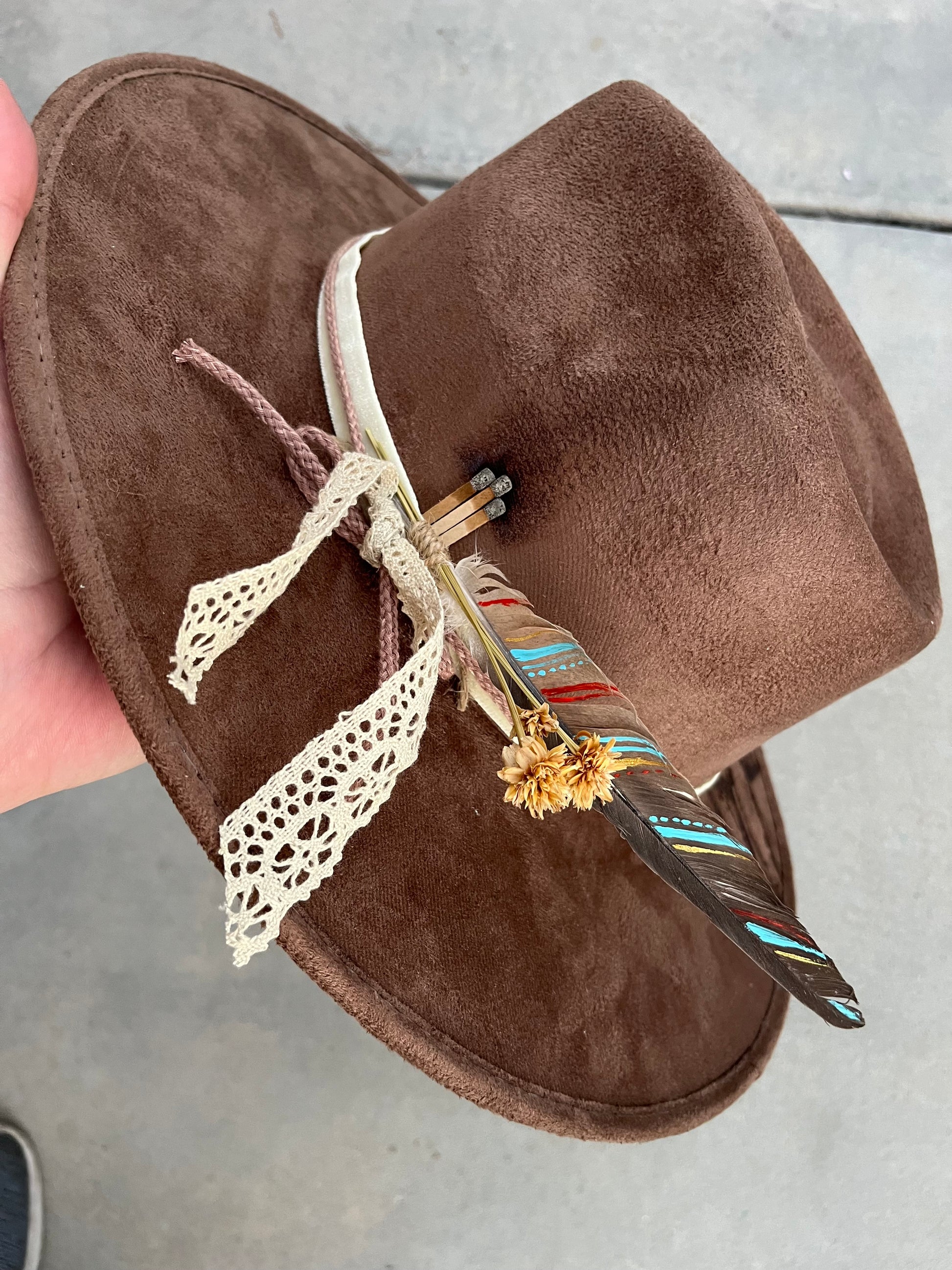 This handmade painted hat would make the perfect addition to any wardrobe. It is a wide brim hat. Vegan suede.