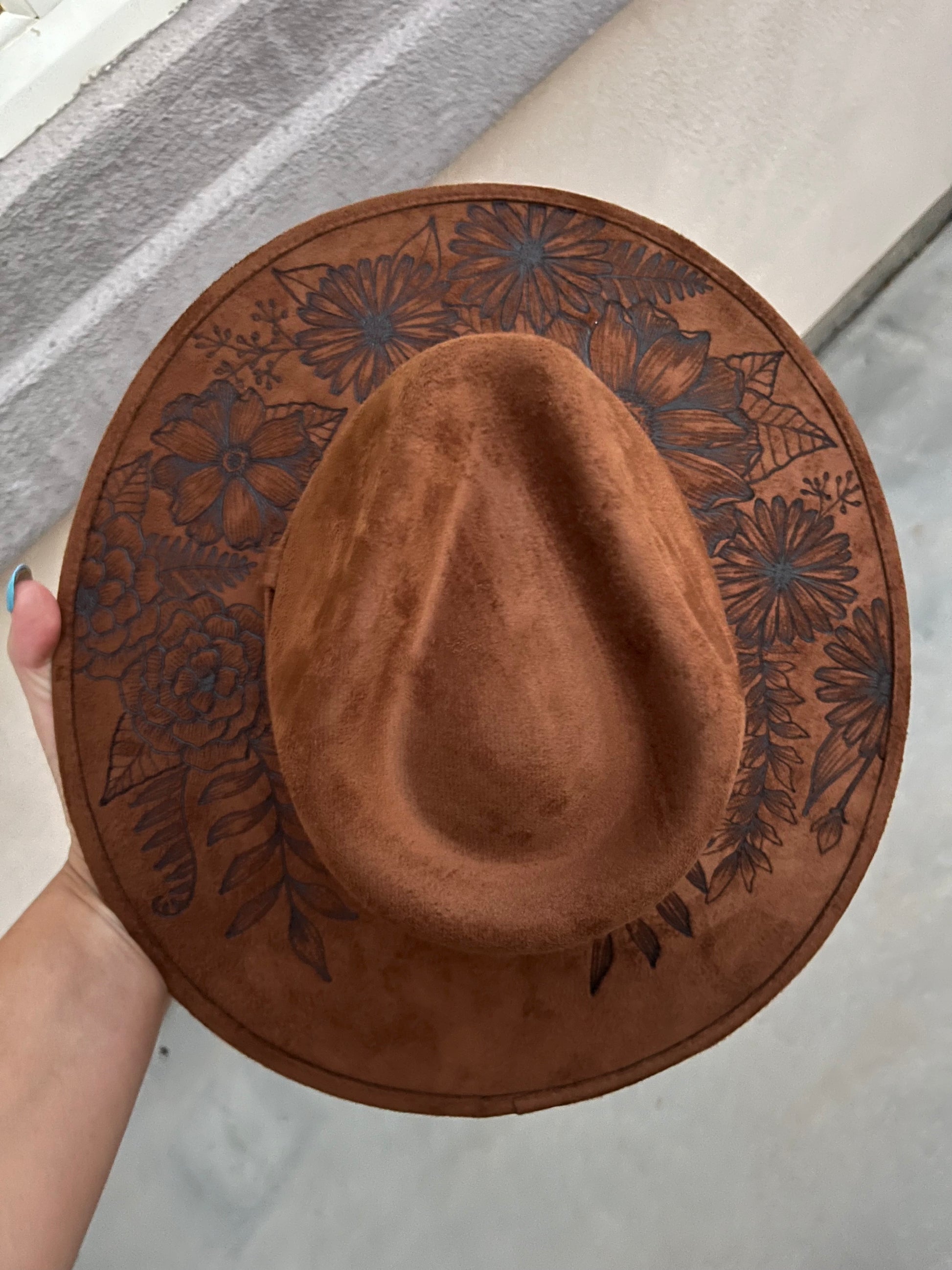 Tobacco floral burned suede wide brim rancher hat