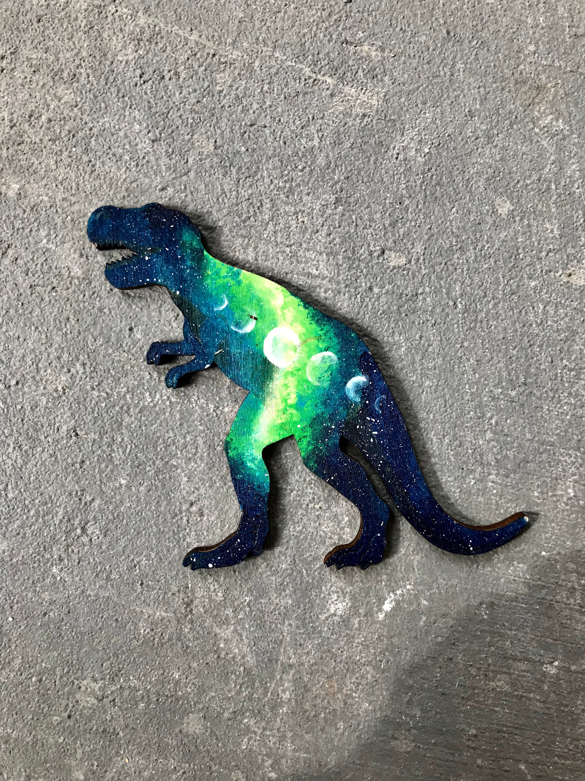 One of a kind galaxy moon phases on t-Rex wood cutout.