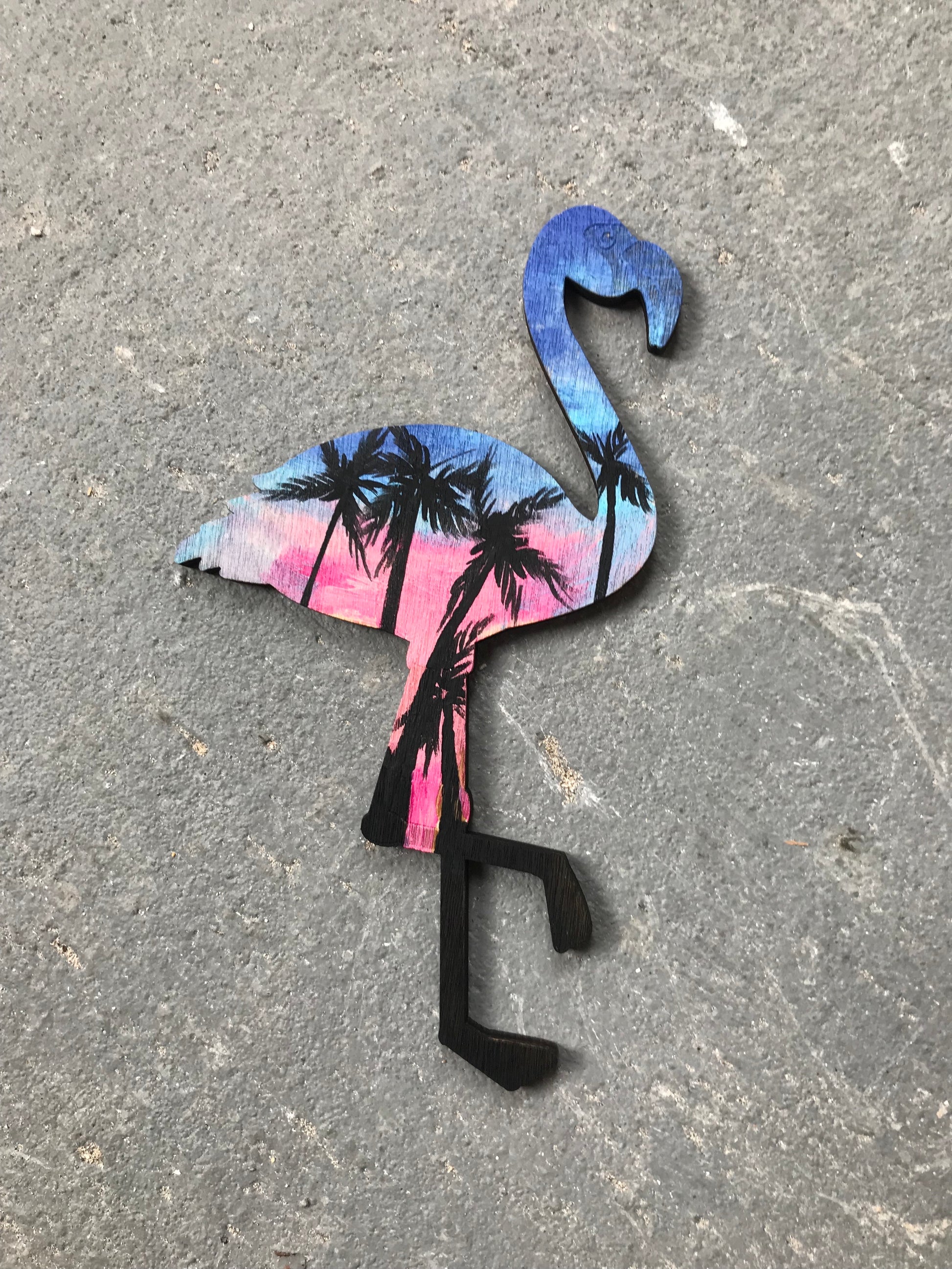 One of a kind beach painting on flamingo wood cutout.