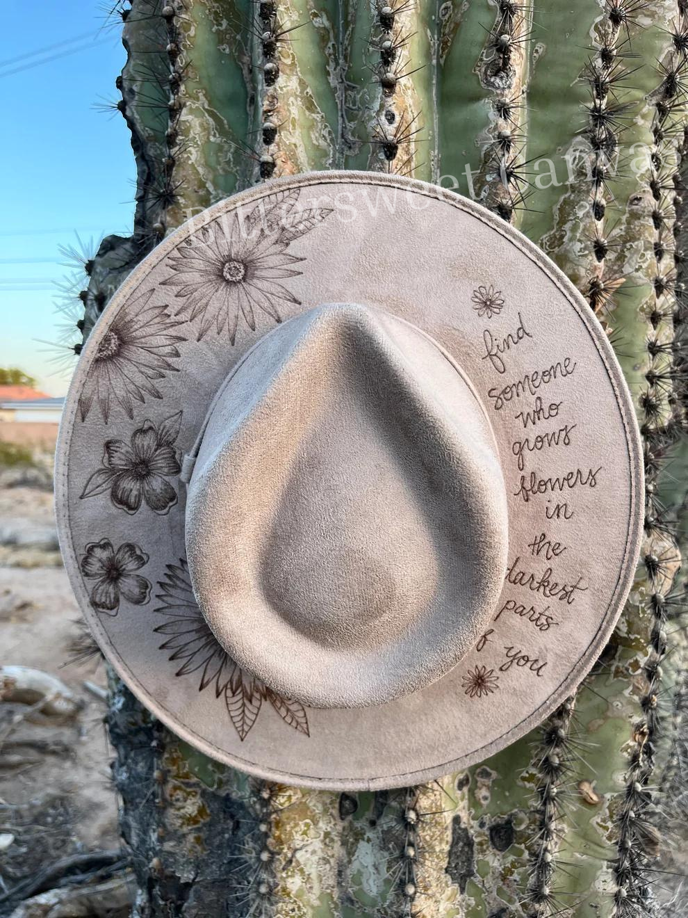 Flowers music lyric inspired taupe burned suede wide brim rancher hat