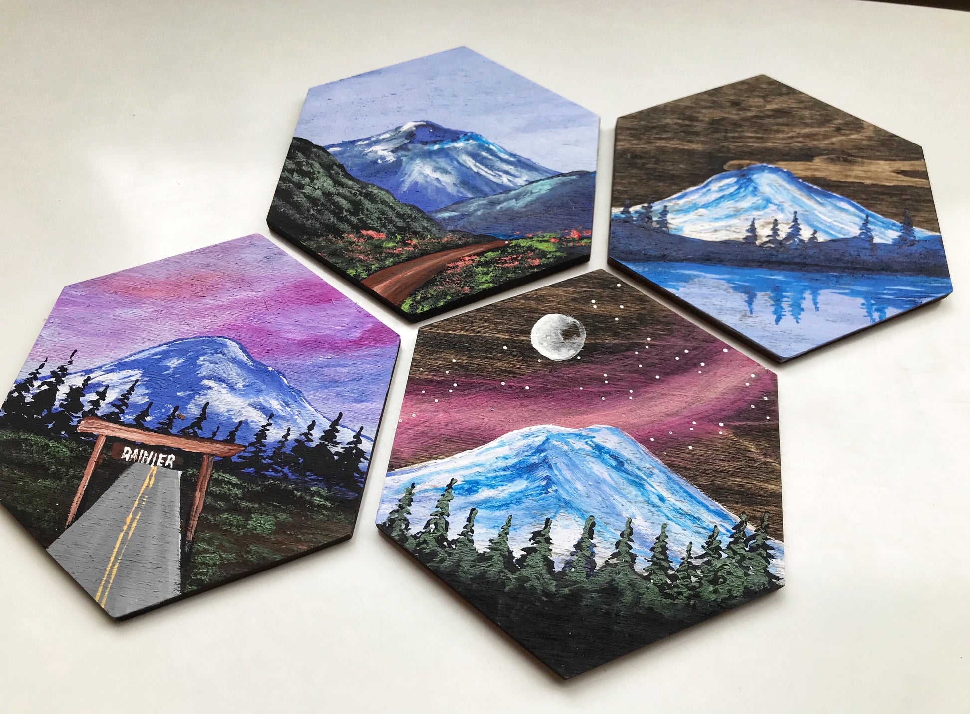 One of a kind handpainted wood coasters featuring mt Adams, Mt rainier, Mt Hood, and mt St. Helens