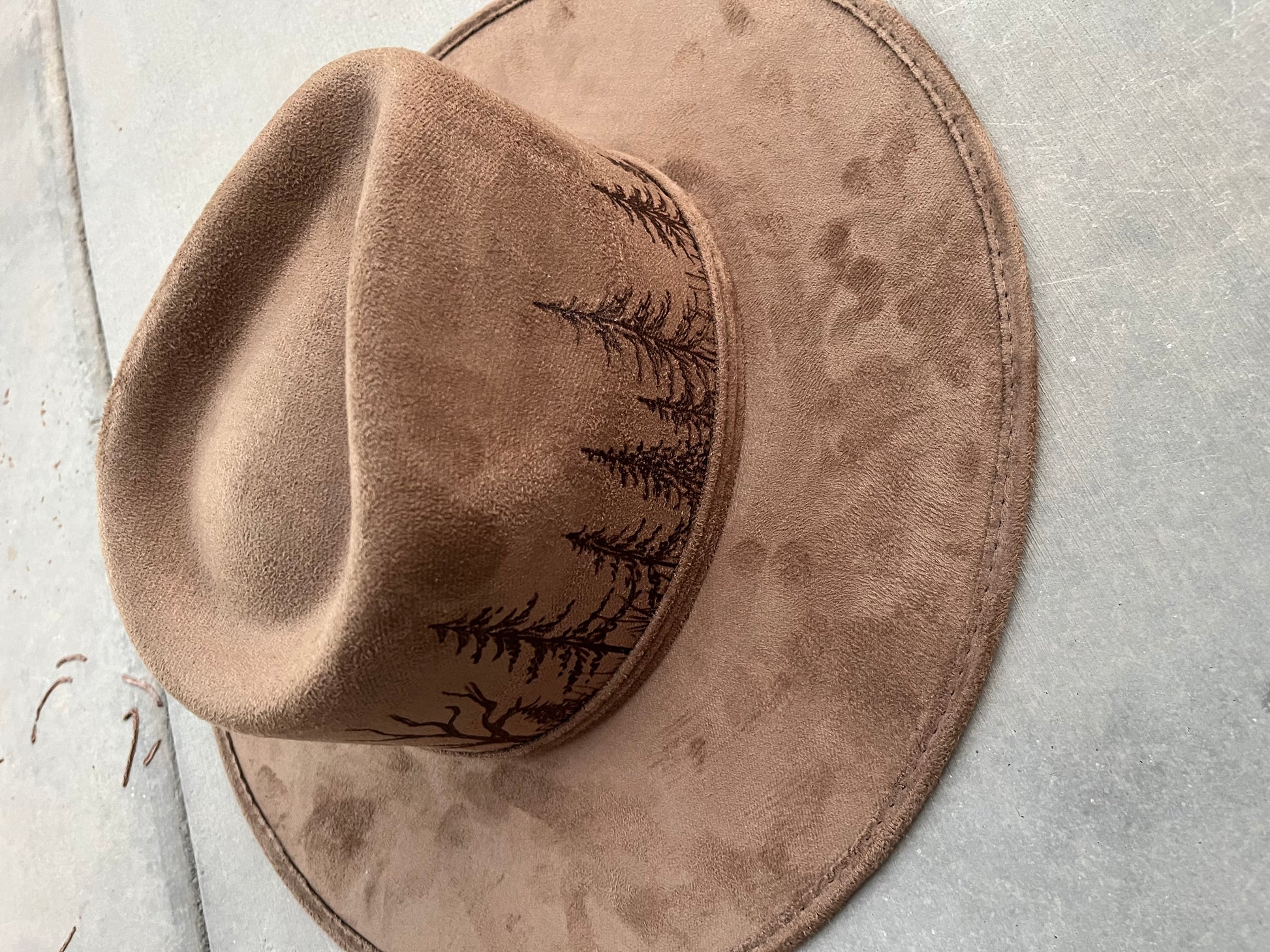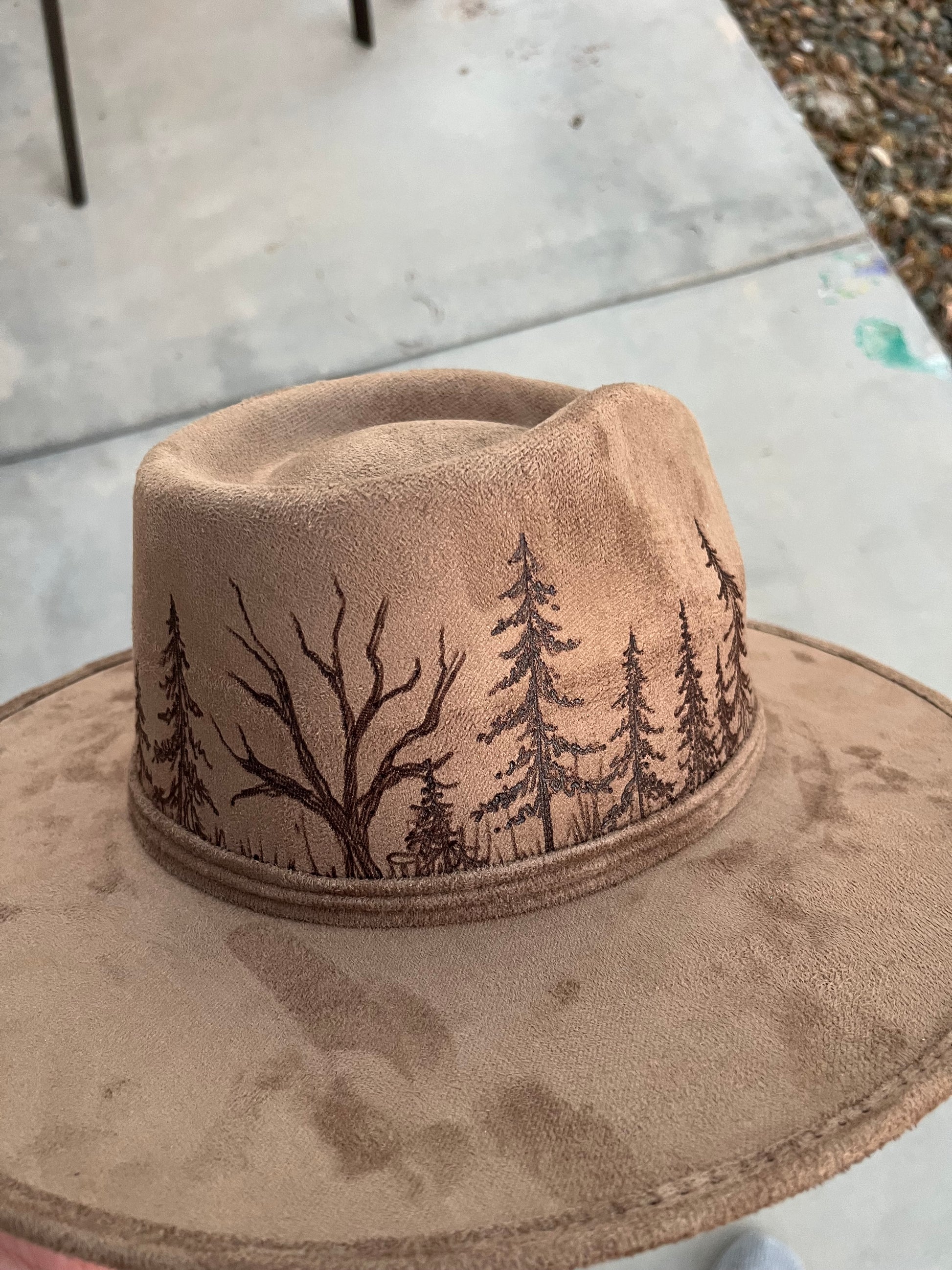 This handmade burned hat would make the perfect addition to any wardrobe. It is a wide brim hat. Vegan suede.