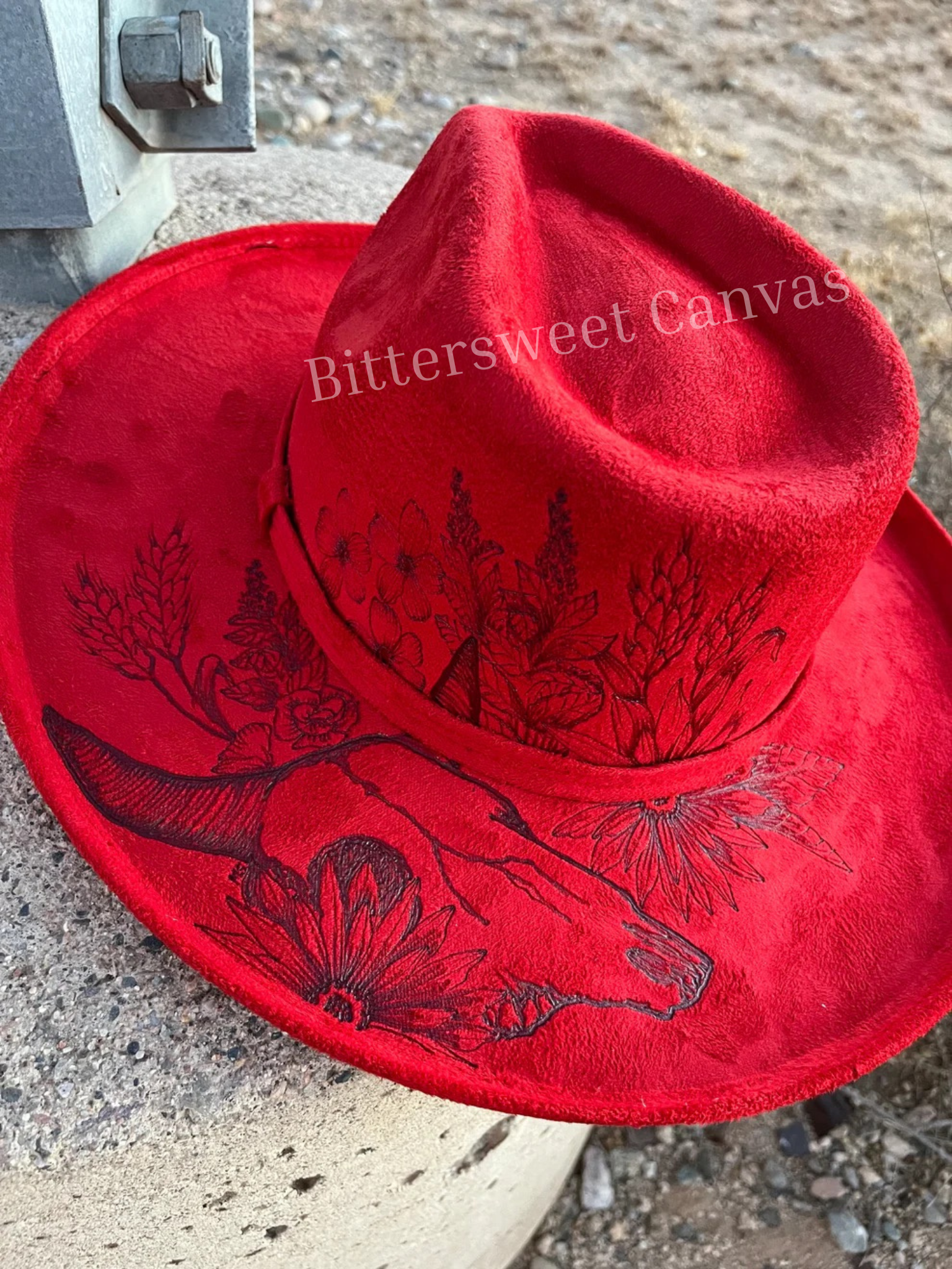 This handmade burned hat would make the perfect addition to any wardrobe. It is a wide brim hat. Vegan suede.