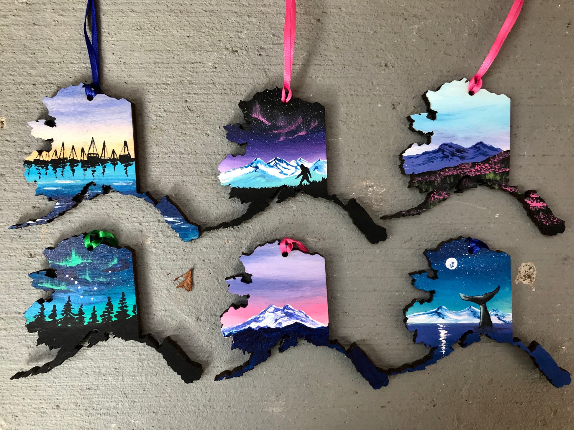 This set of handmade painted ornaments would make the perfect addition to any Christmas tree. It makes a perfect gift for a friend, parent, etc, to commemorate a favorite place. It made of Baltic birch plywood, roughly 4” in size, and comes with a ribbon for hanging.