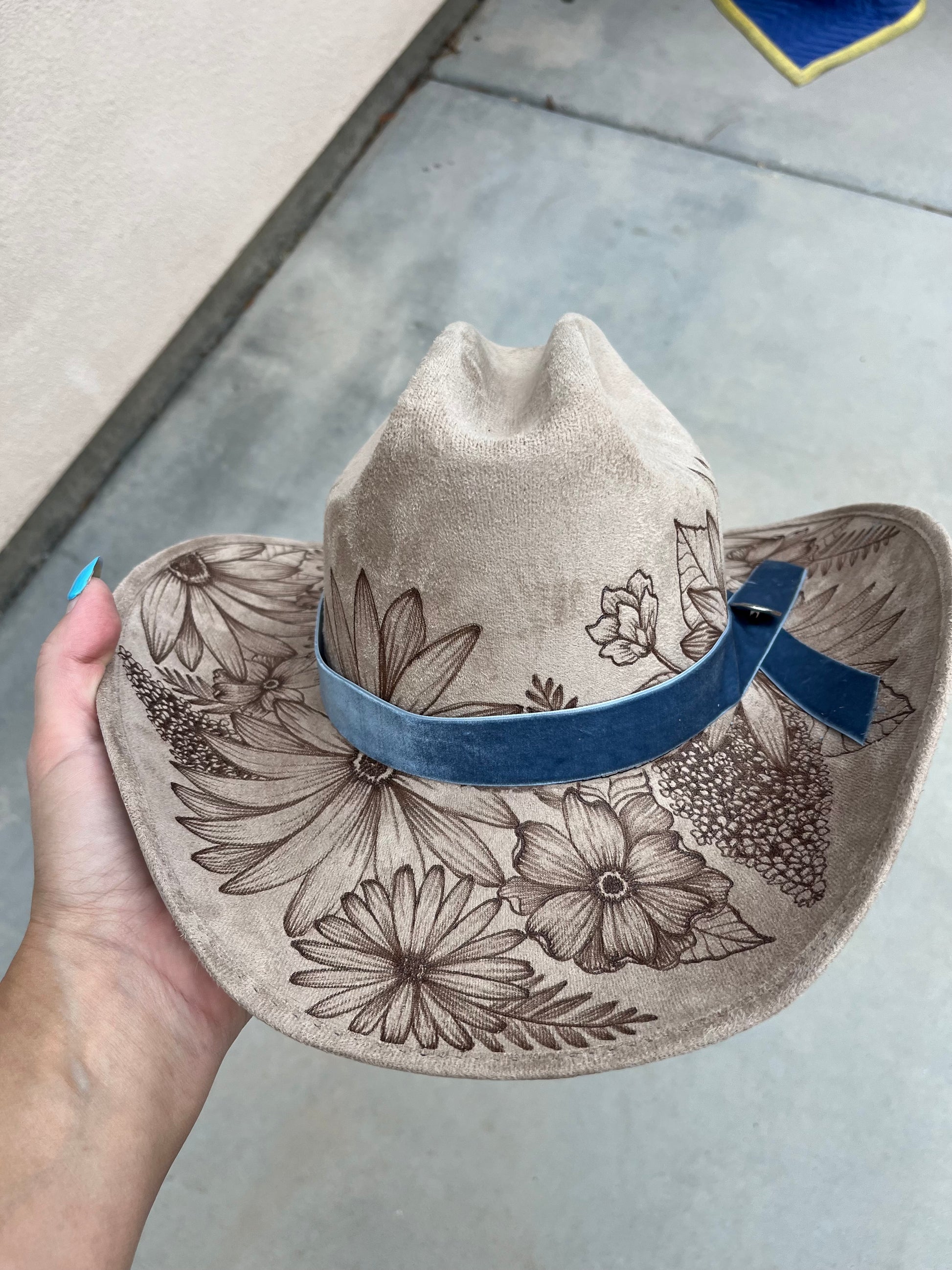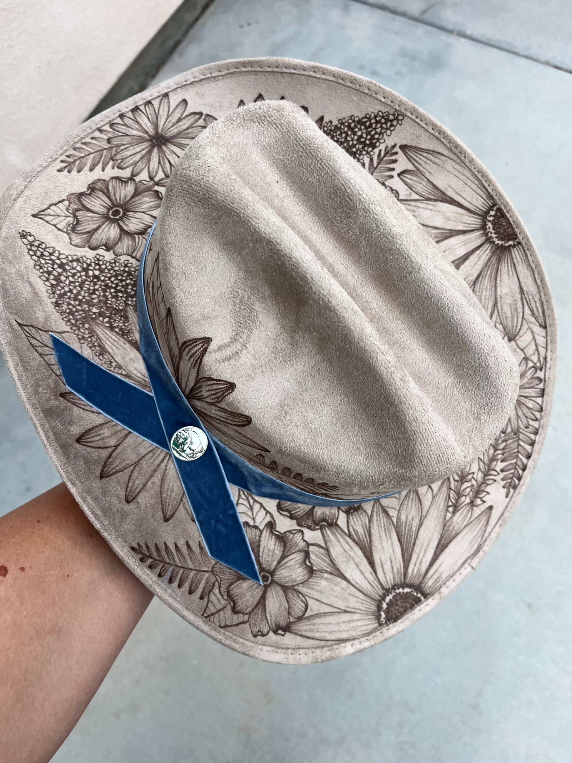 This handmade hat would make the perfect addition to any wardrobe. It is a wide brim hat. Vegan suede.