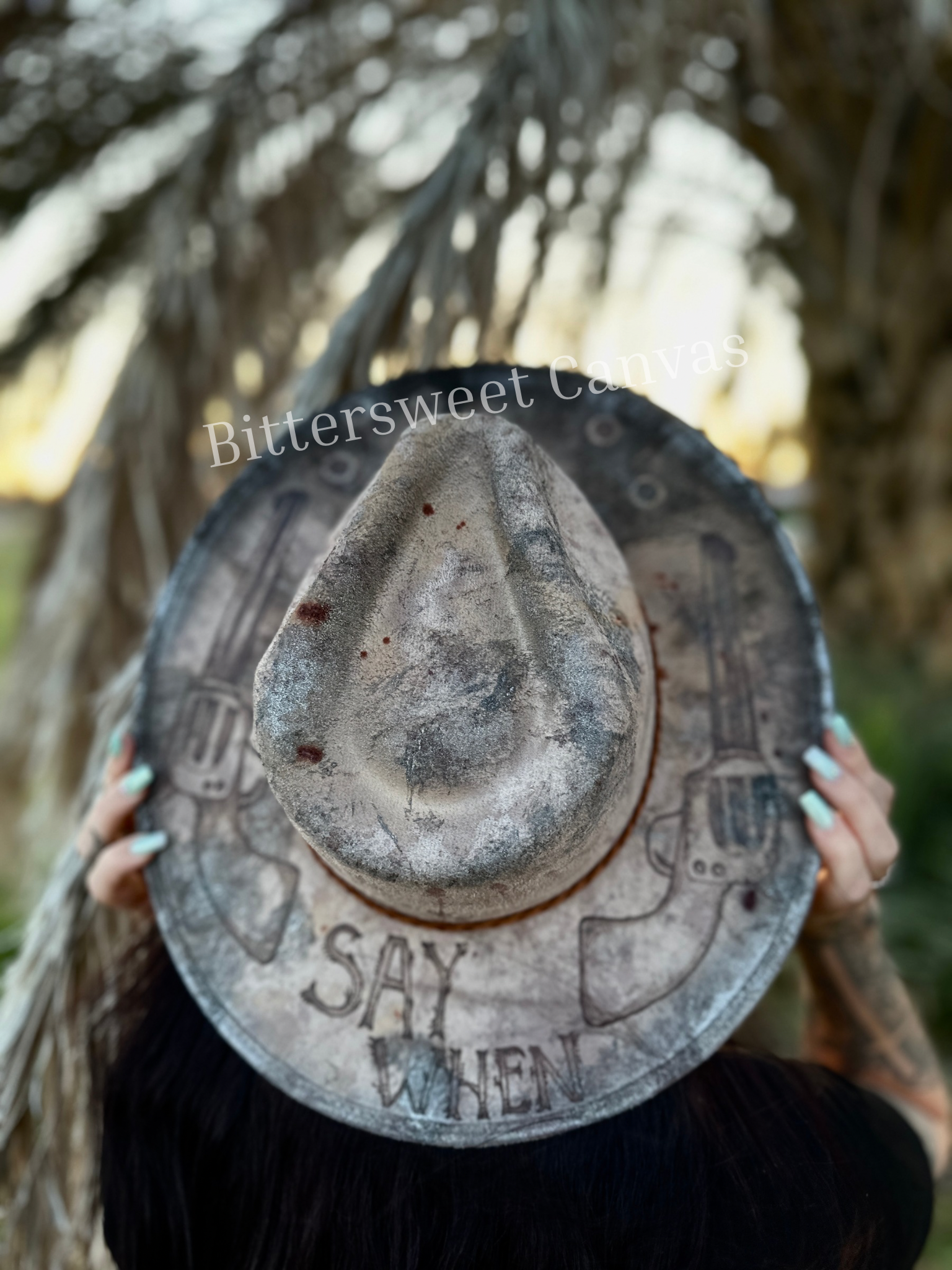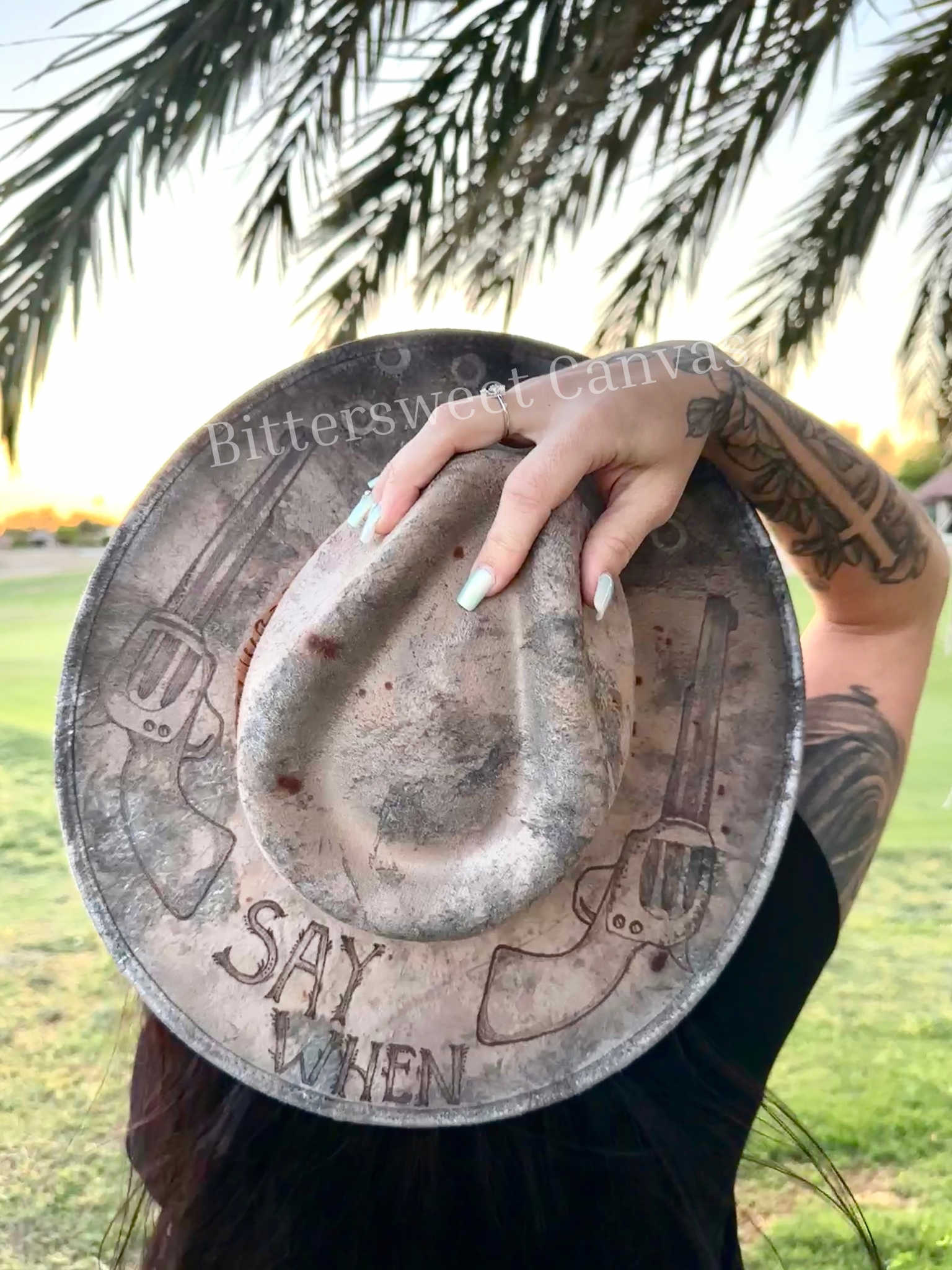 Taupe say when revolver tombstone distressssd burned suede wide brim rancher hat