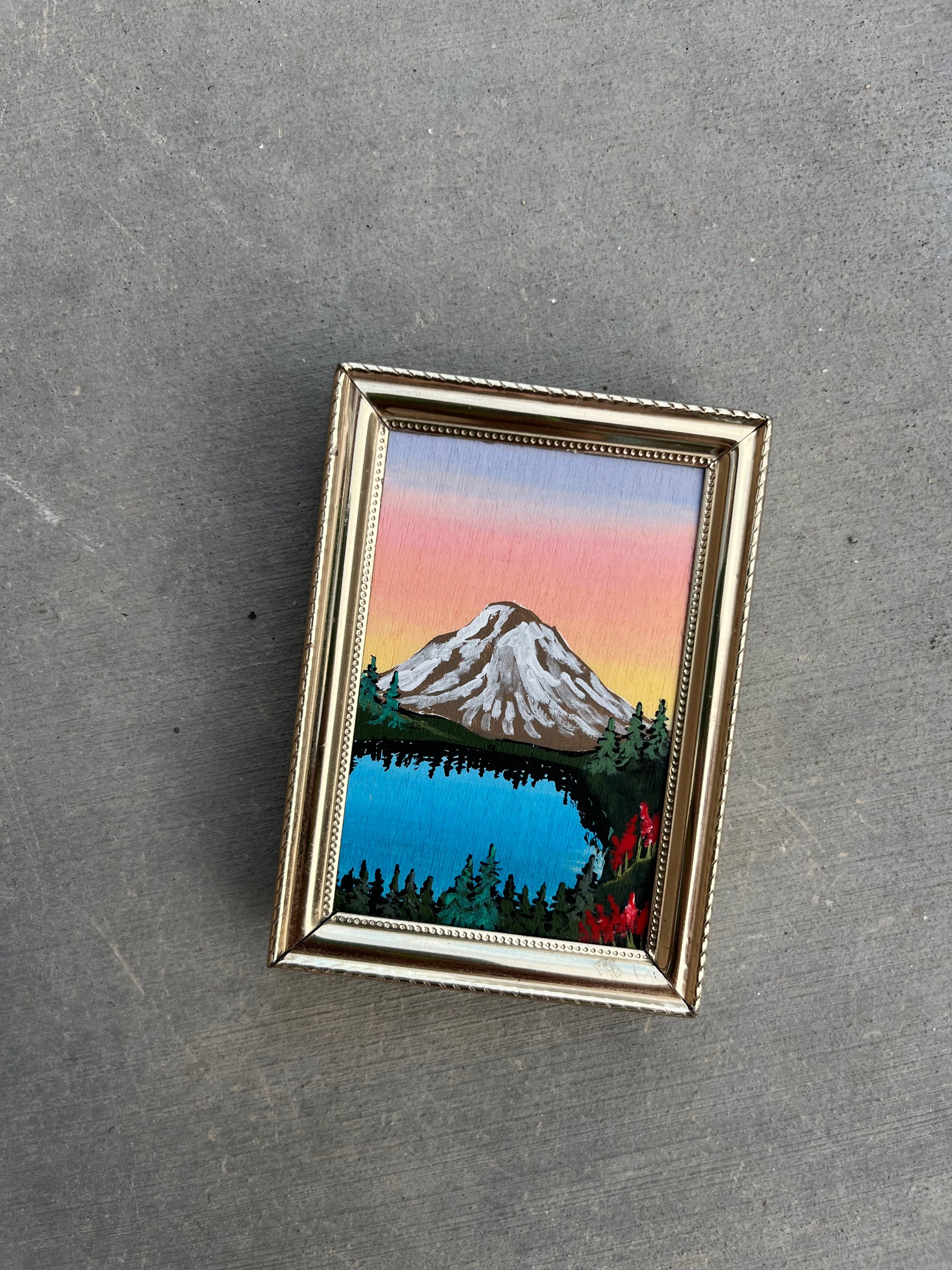 Cute little 2x3” original painting in gold frame. Perfect addition to any shelf.