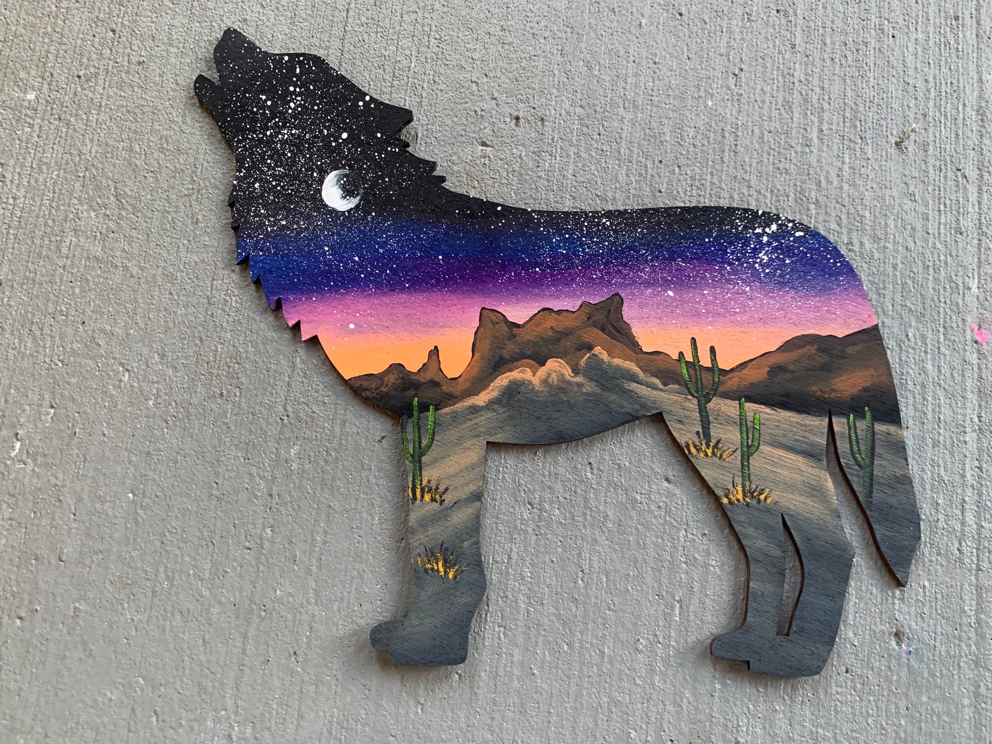 Wolf desert mountains wood cutout painting